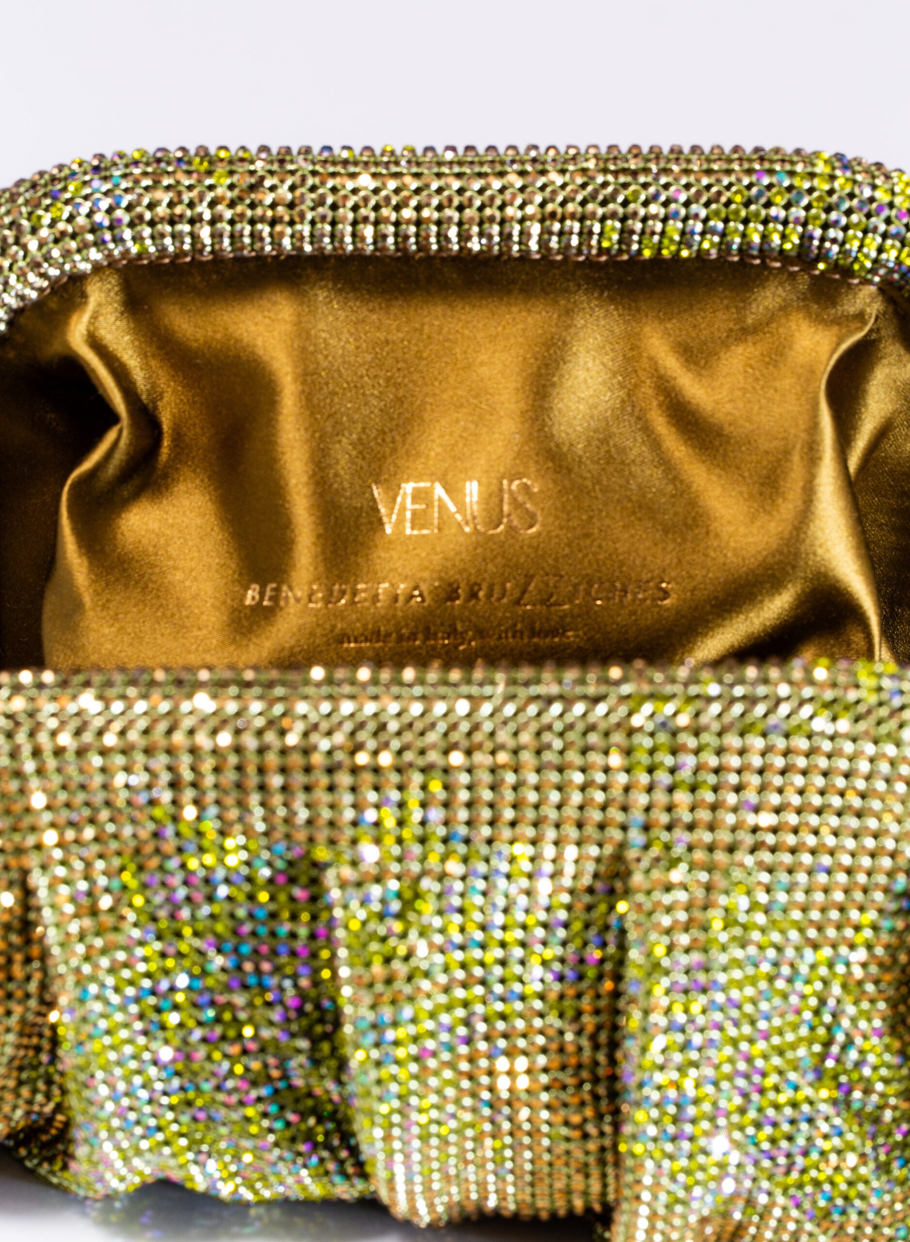I welcome the love that flows through me like a wave that rolls, breaks on the rock and foams. Like a shower that smokes, boils and fertilizes the burning earth. Like a perfume that rises from the sea, it spreads and saturates the air around. So my body is reborn on Venus. This clutch is a tribute to the goddess of Love and Beauty and the magical moment in which every woman, who loves and is loved, is transformed. From mortal becomes goddess in a perfect personification of Venus. With soft and wavy shapes, Venus is made with a network…