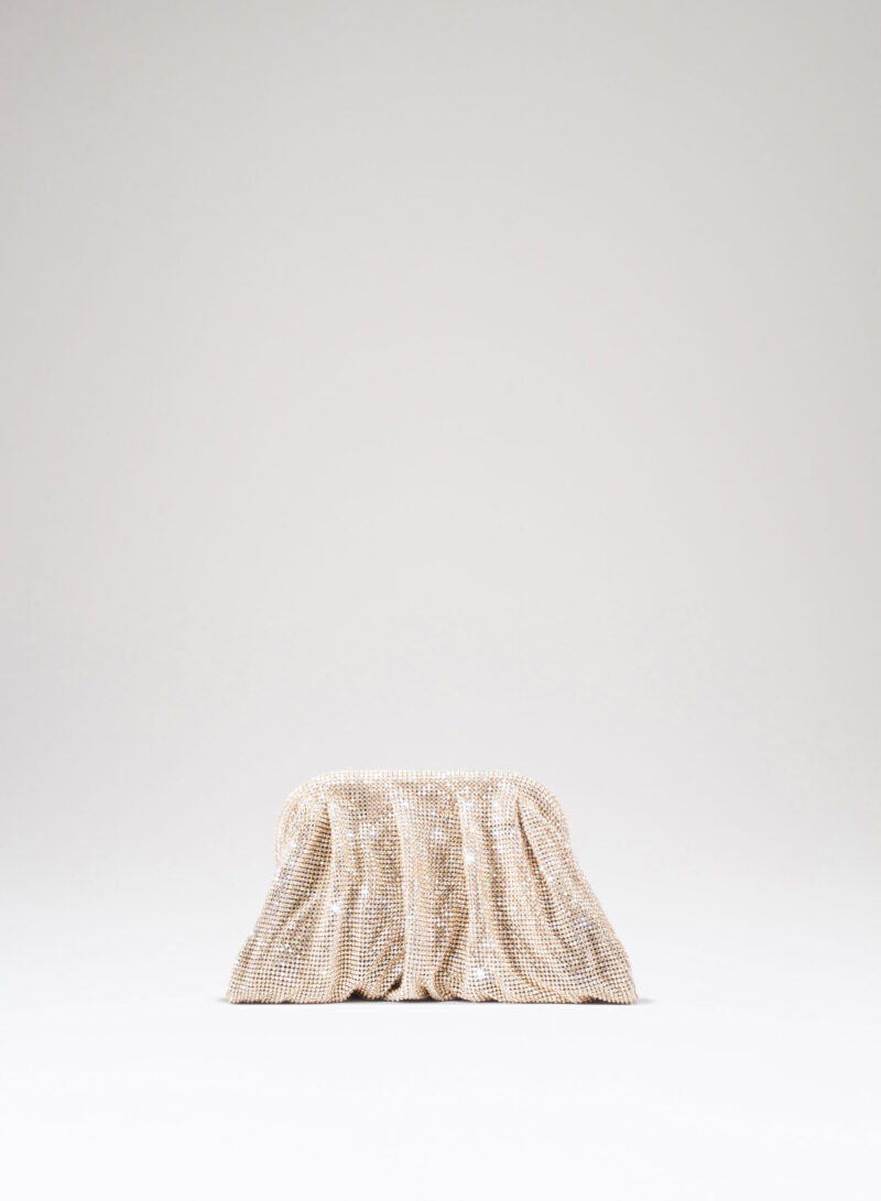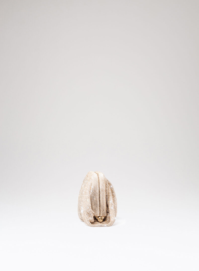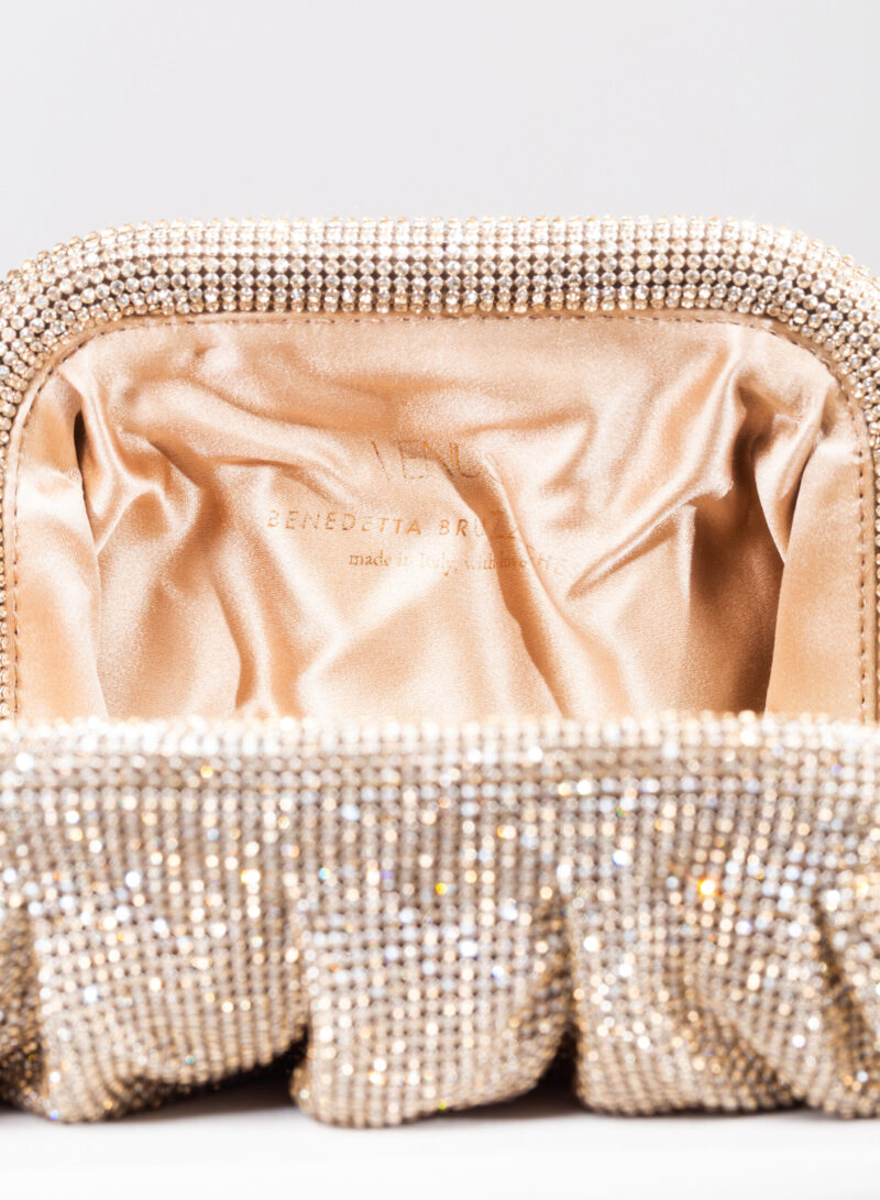 Dalle forme morbide e ondulate, Venus è realizzata con una rete di scintillanti cristalli cucita a mano con la stessa attenzione che si dedicherebbe a un gioiello. Al suo interno, una pochette in raso di seta è pronta ad accogliere il necessario per una serata fuori.