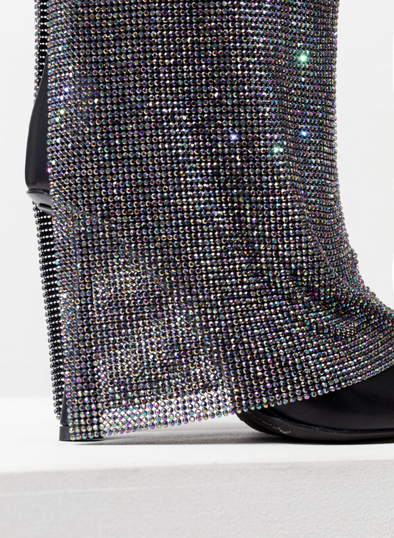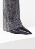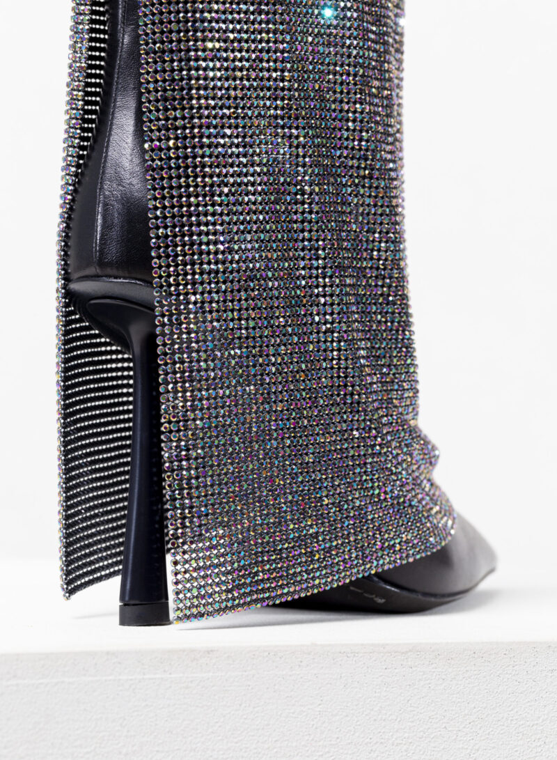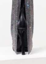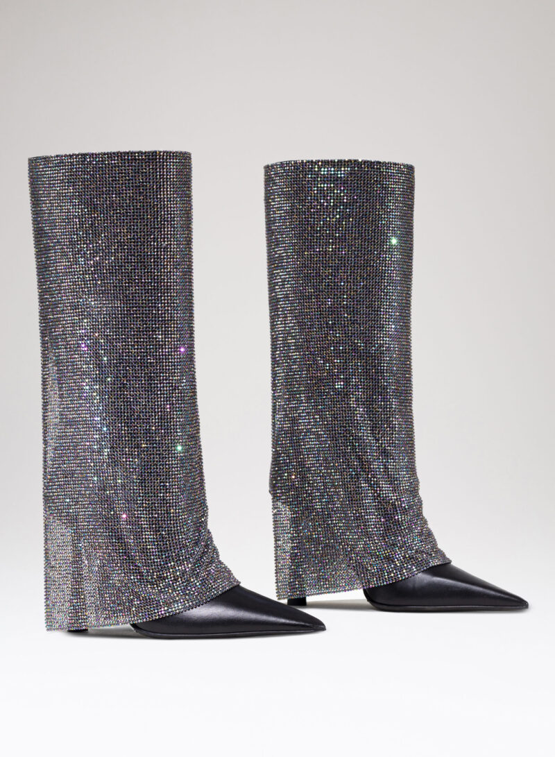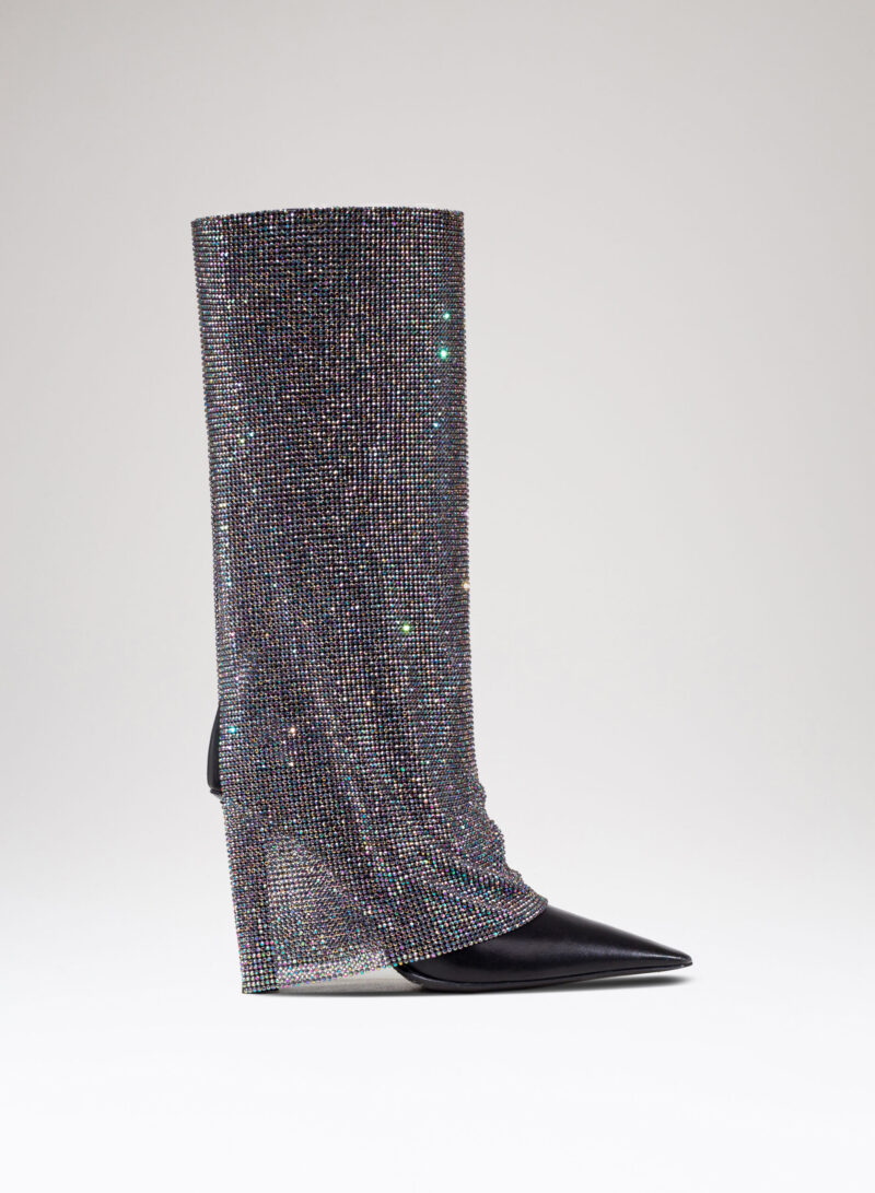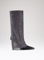 Anche lo stivale Virginia, con la sua zeppa in plexiglass ed il drappo in crystal mesh, è pionieristico come l’artista a cui è ispirato.