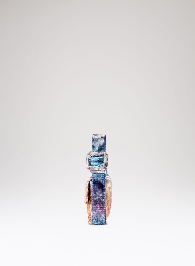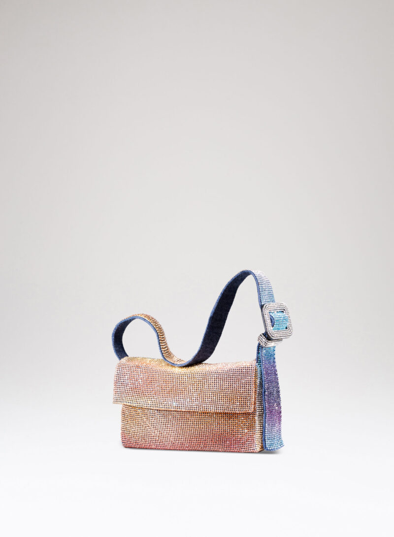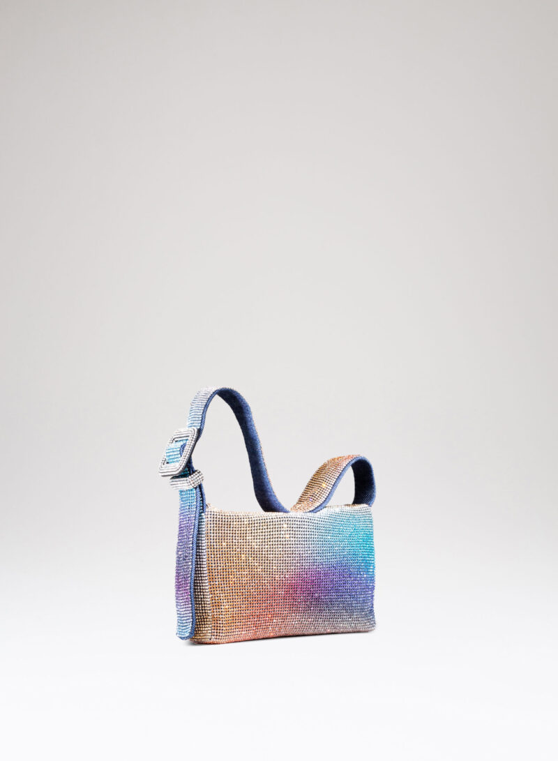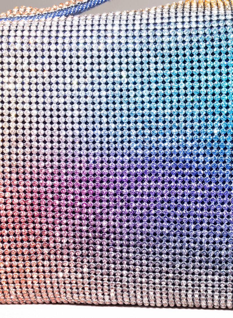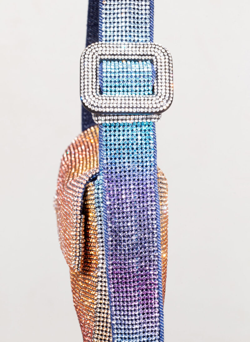Ama essere abbracciata stretta e sa ricambiare trepidante con la morbidezza di un corpo in denim cucito a mano. Se la porti fuori e la tieni sottobraccio, che sia per un chiaro di luna o solo per una lucciola, con il suo vestito di rete di cristalli sa inondarti gentilmente dei suoi tremolanti riflessi: è il suo modo di arrossire.