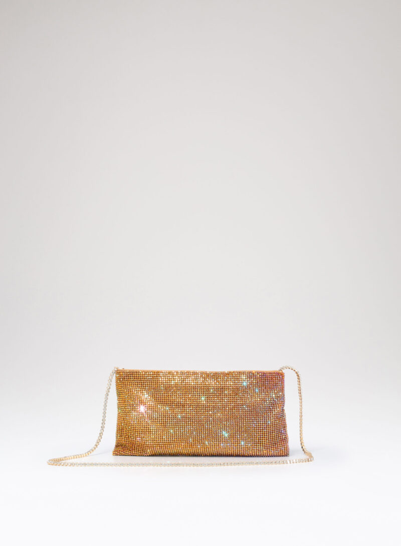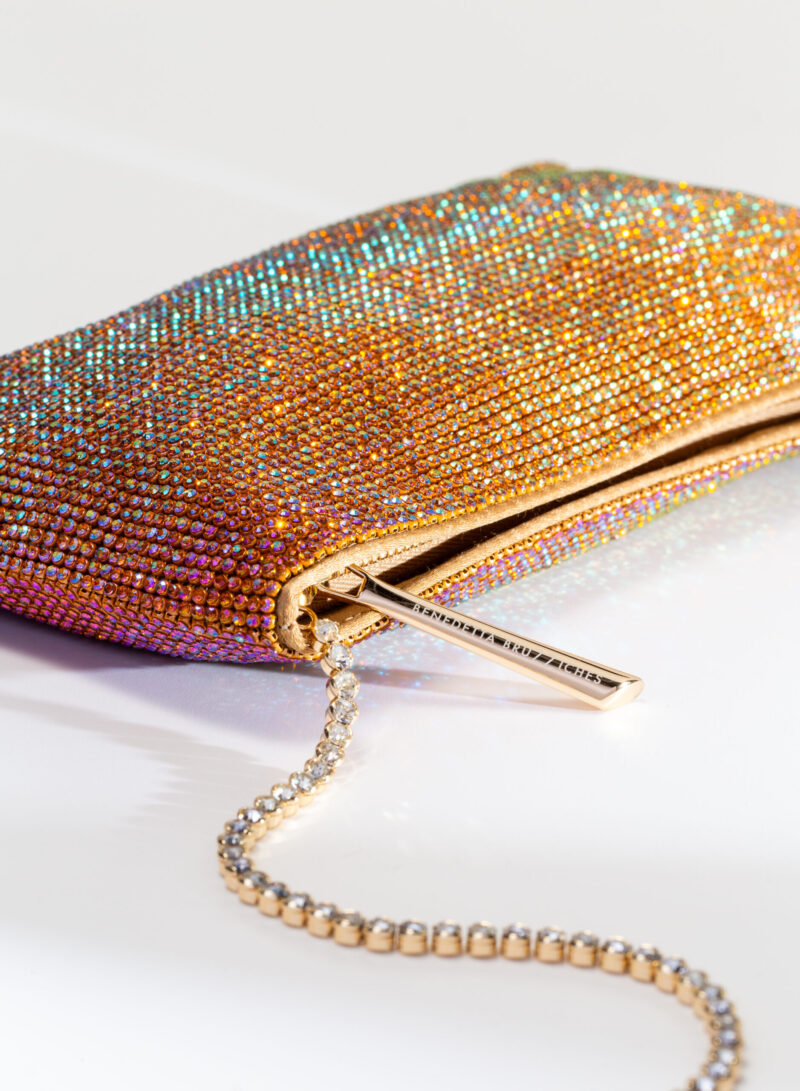 Nata per custodire soltanto ciò che davvero è importante, è una mini pochette realizzata con una morbida rete di cristalli foderata in raso di seta organica, interamente cucita a mano. Un’elegante tracolla di cristalli consente di indossarla anche a spalla.