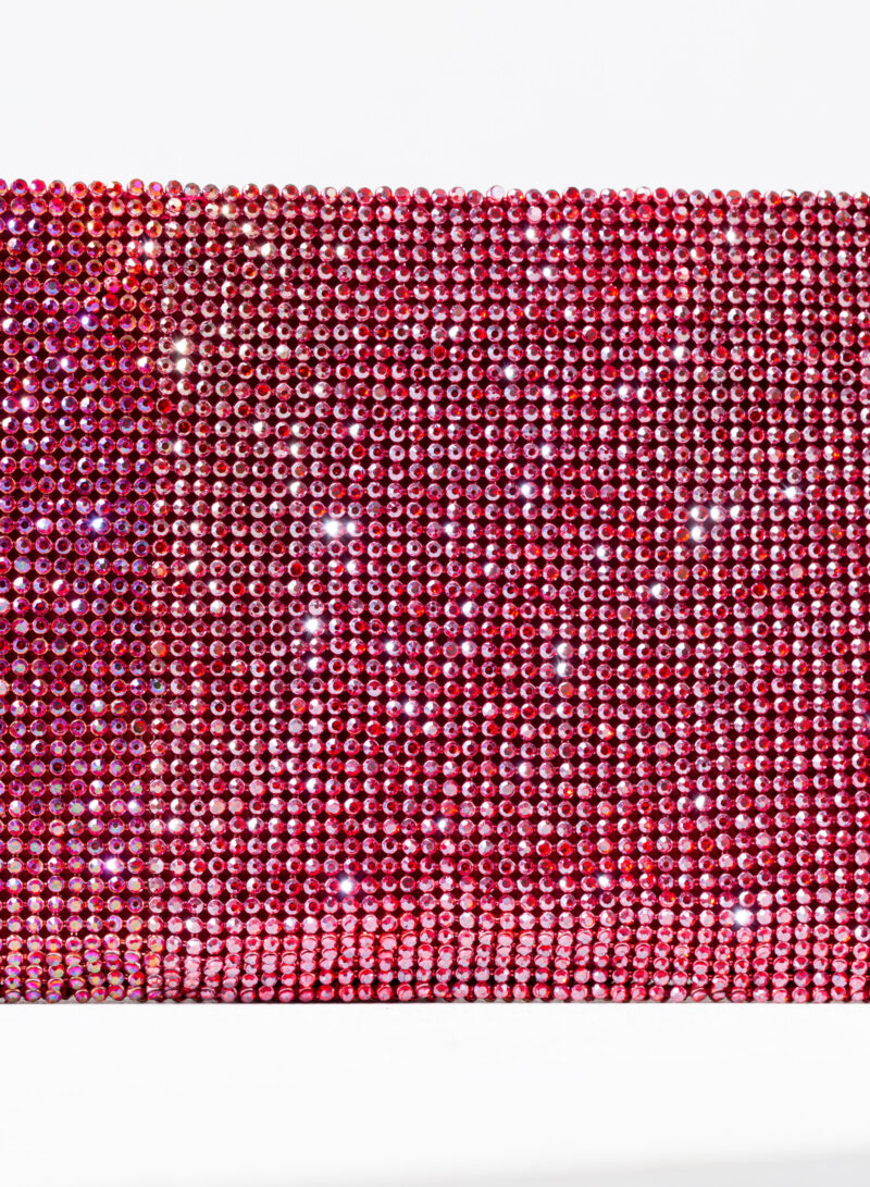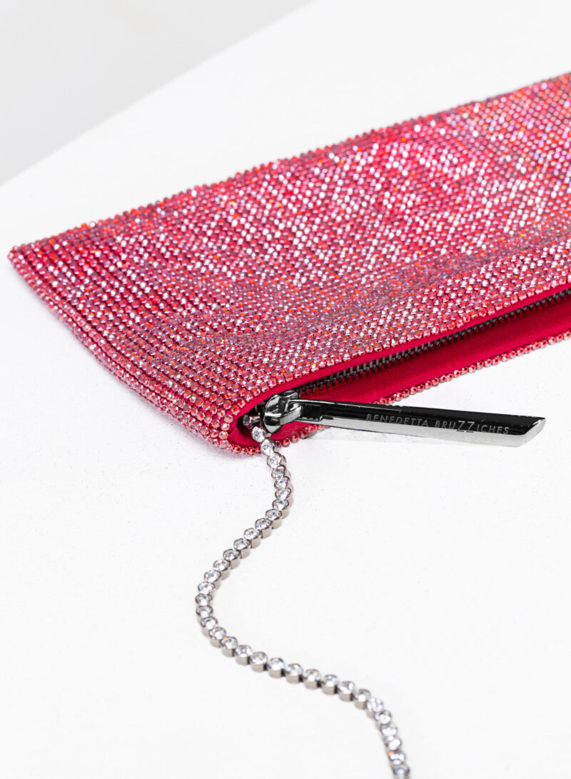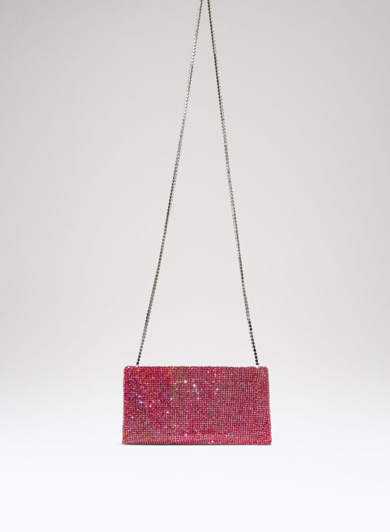 Nata per custodire soltanto ciò che davvero è importante, è una mini pochette realizzata con una morbida rete di cristalli foderata in raso di seta , interamente cucita a mano. Un’elegante tracolla di cristalli consente di indossarla anche a spalla.