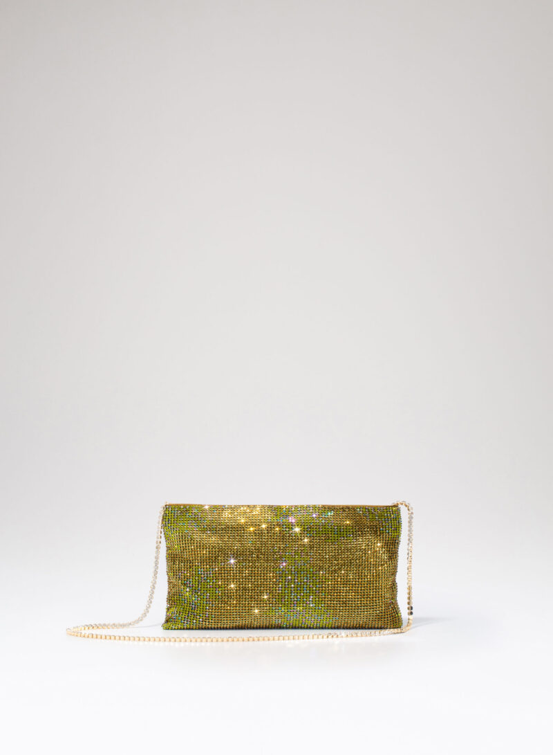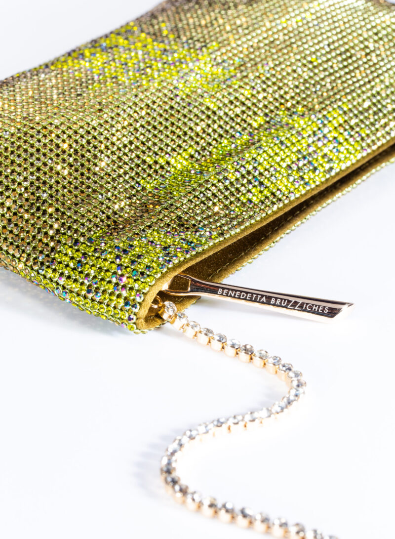 Nata per custodire soltanto ciò che davvero è importante, è una mini pochette realizzata con una morbida rete di cristalli foderata in raso di seta organica, interamente cucita a mano. Un’elegante tracolla di cristalli consente di indossarla anche a spalla.