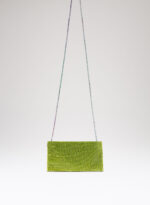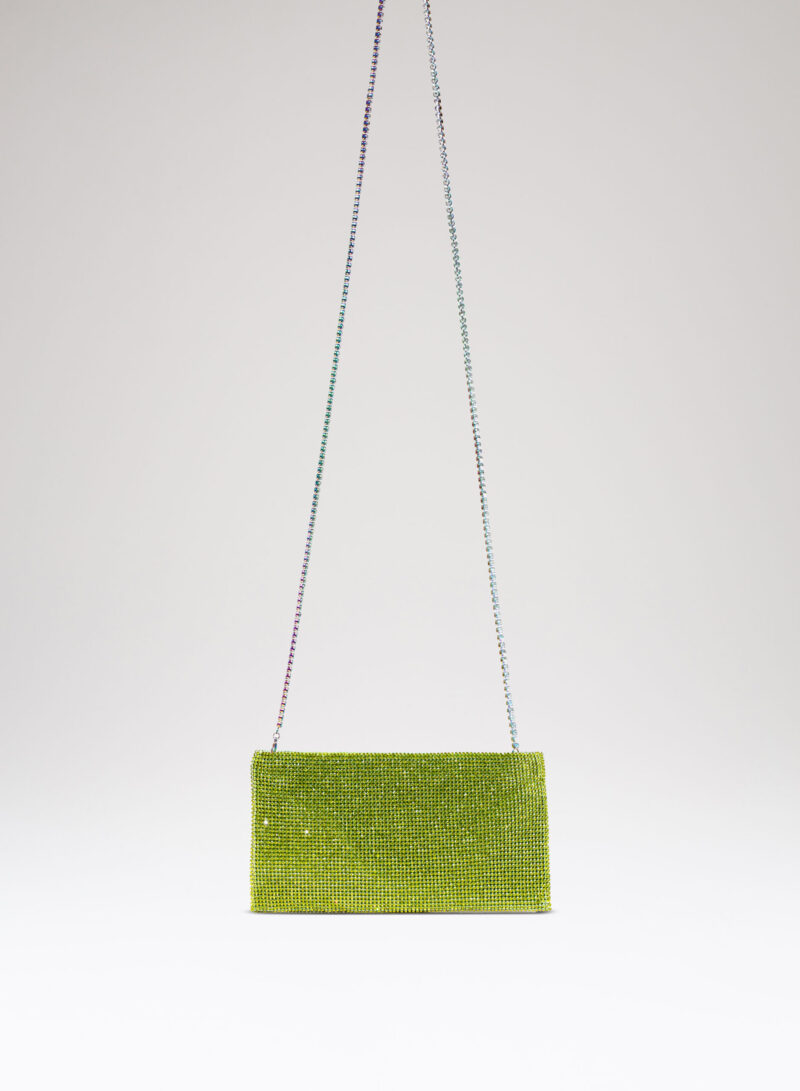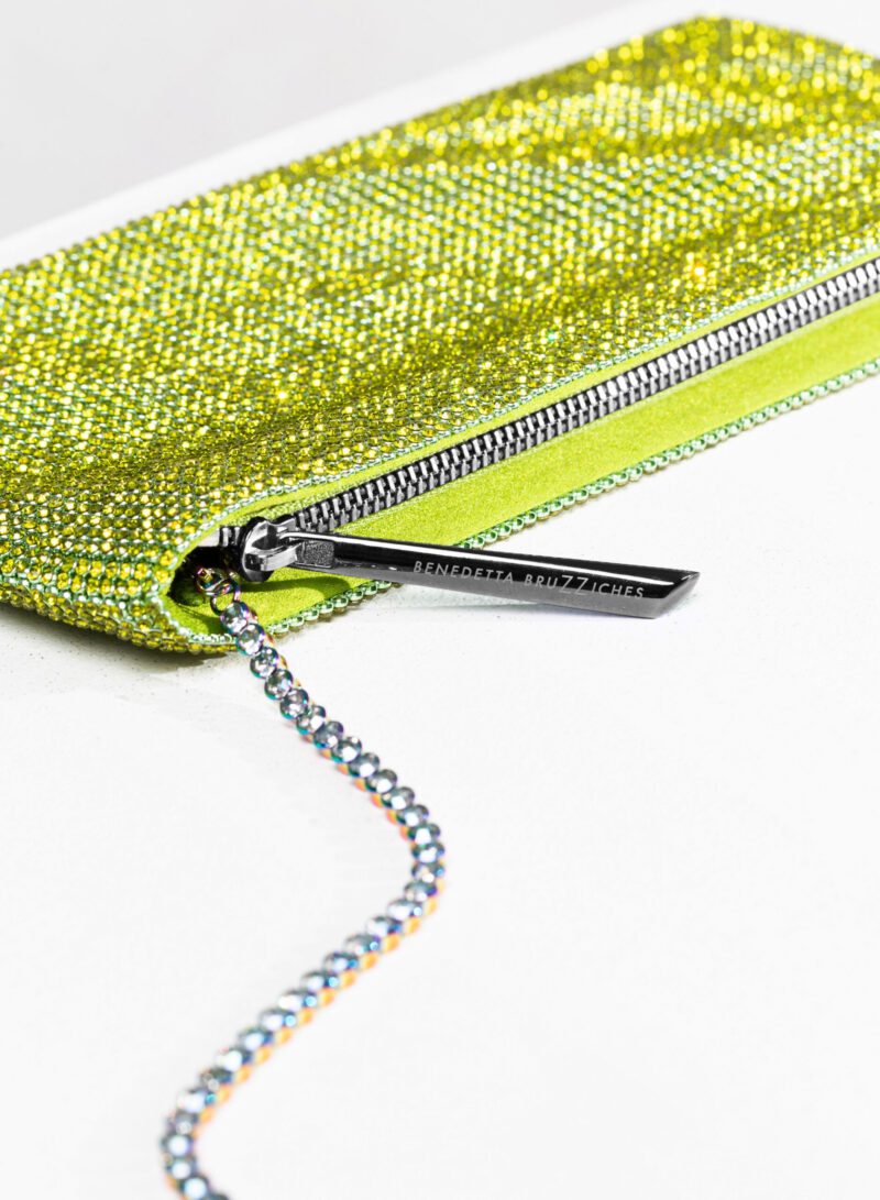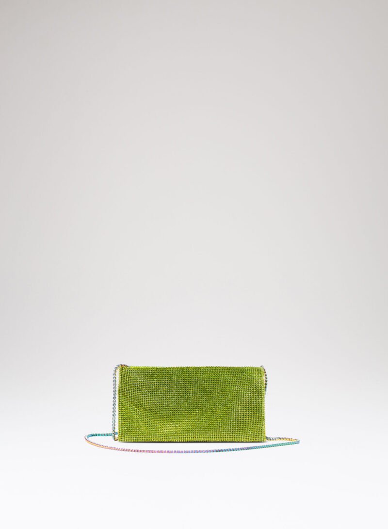 Nata per custodire soltanto ciò che davvero è importante, è una mini pochette realizzata con una morbida rete di cristalli foderata in raso di seta organica, interamente cucita a mano. Un’elegante tracolla di cristalli consente di indossarla anche a spalla.