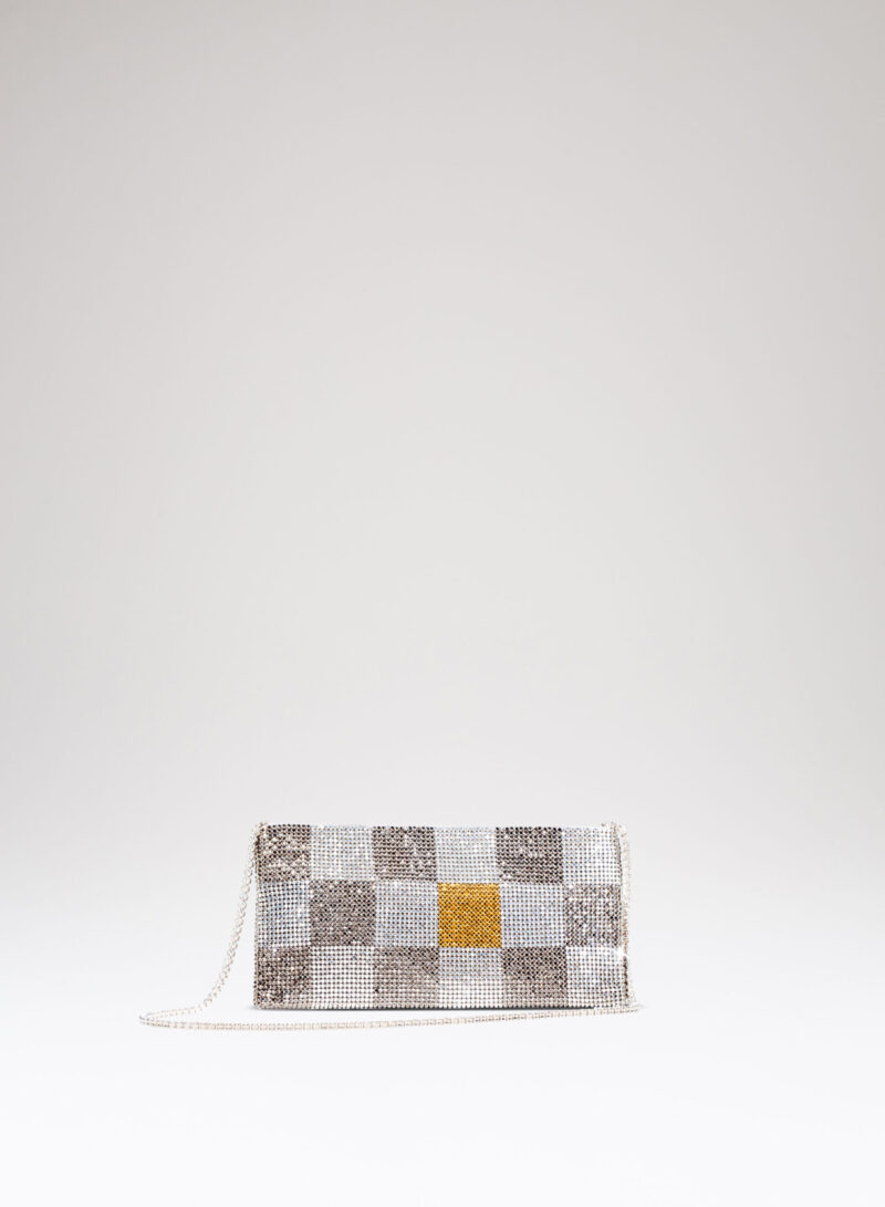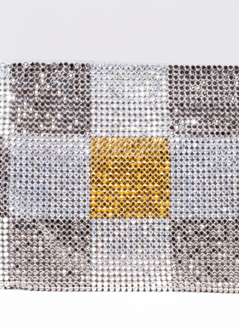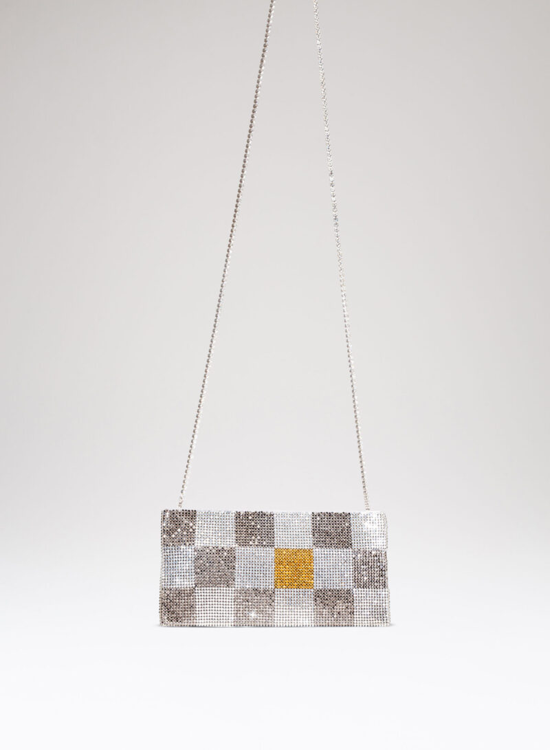Nata per custodire soltanto ciò che davvero è importante, è una mini pochette realizzata con una morbida rete di cristalli foderata in raso di seta organica, interamente cucita a mano. Un’elegante tracolla di cristalli consente di indossarla anche a spalla.