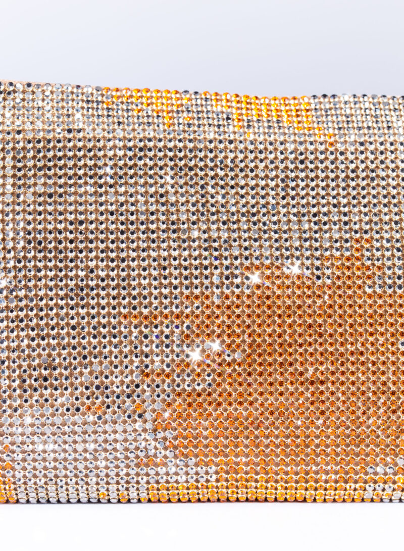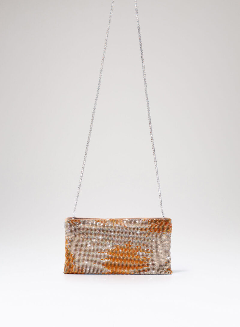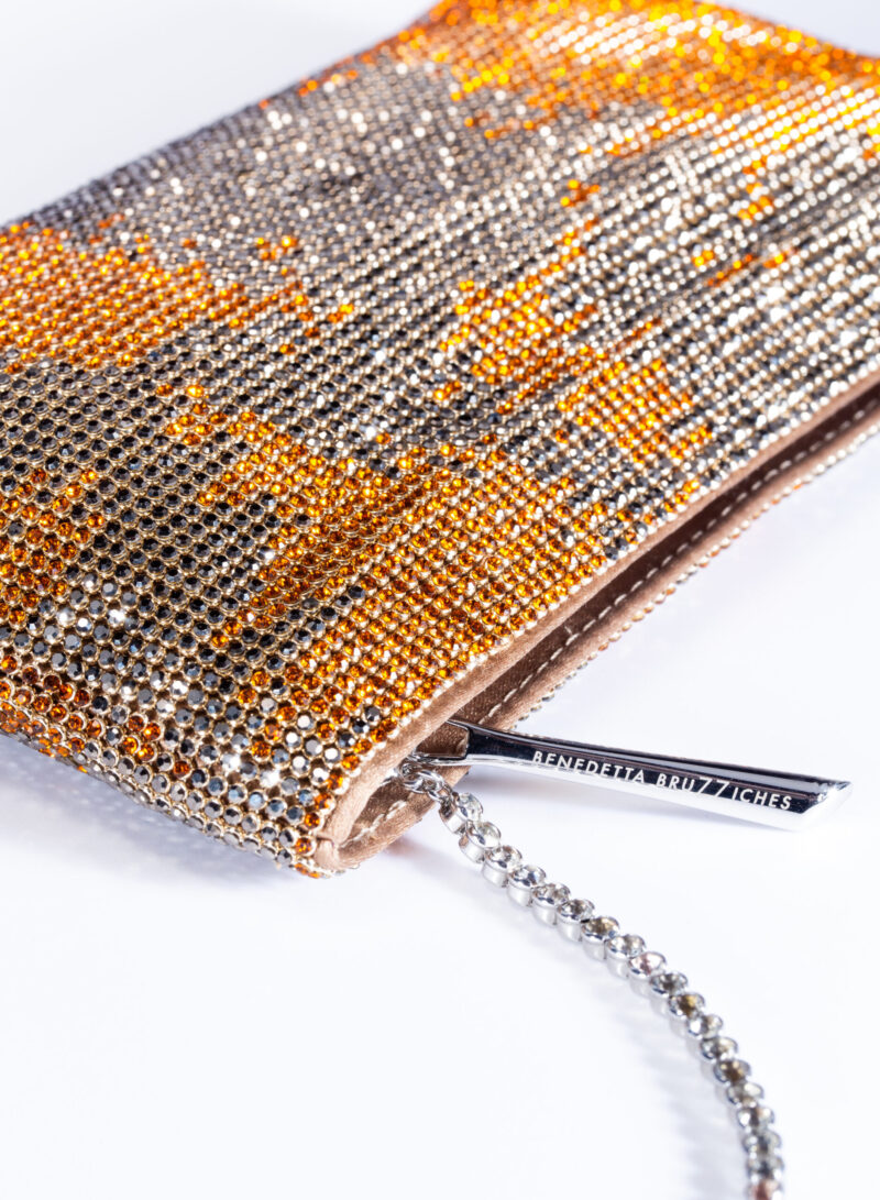Nata per custodire soltanto ciò che davvero è importante, è una mini pochette realizzata con una morbida rete di cristalli foderata in raso di seta organica, interamente cucita a mano. Un’elegante tracolla di cristalli consente di indossarla anche a spalla.